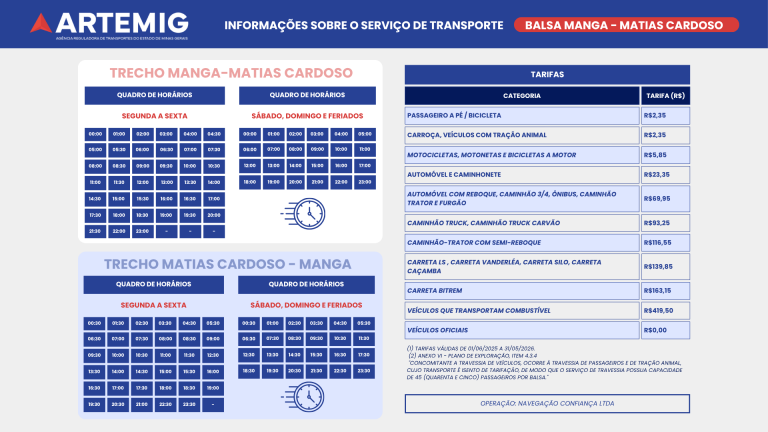 Também são considerados veículos oficiais aqueles das Prefeituras de Manga/MG e Matias Cardoso/MG, a serviço dos Poderes Executivo, Legislativo e Judiciário, desde que credenciados em conjunto pela SEINFRA, ARTEMIG e Concessionária.