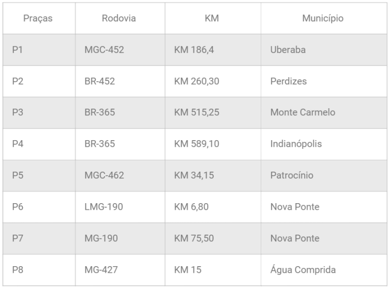 e) Rodovia LMG-798 – Trecho compreendido entre o km 0,00, no entroncamento com a MG-190, no município de Nova Ponte (MG), e o km 42,50, no município de Uberaba (MG), totalizando 42,50 km;