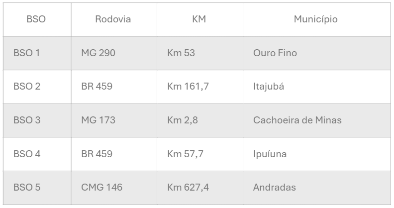 f) Rodovia BR 459 – Trecho compreendido entre o km 11,30 no entroncamento com a CMG-146, no município de Poços de Caldas (MG) e o km 166,50 no entroncamento com a BR-383, no município de Itajubá (MG), totalizando 155,20 km;